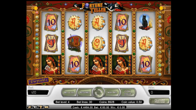 В игровом автомате Гадалка 5 активных барабанов, 30 рабочих линий, спецсимволы, бонусный раунд и автоплей. Диапазон ставки — от 1 до 5 монет, стоимостью от 1 до 50 центов. Выбрать размер ставки пользователь сможет самостоятельно. Новичкам стоит начинать с минимальной суммы.