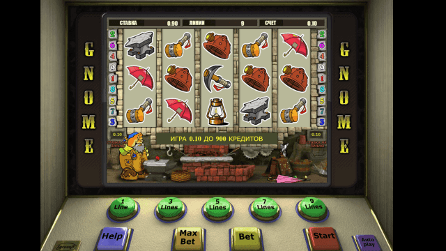 В видеослоте Gnome имеется 5 барабанов и 9 линий. Действует многоуровневая система ставок. Количество активных линий можно изменять. Стоимость одного кредита равняется одному рублю. Минимальная ставка на каждую линию — 1 руб., максимальная — 90 единиц игровой валюты.