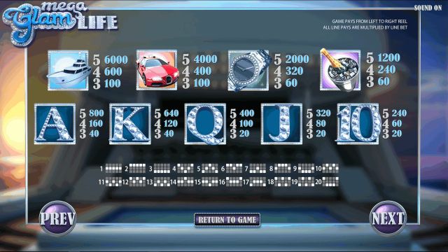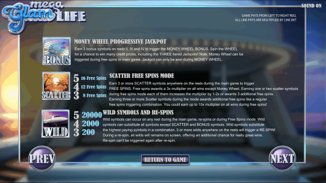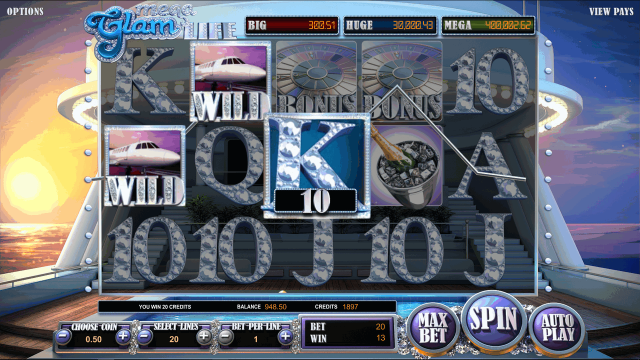 Особенности слота — стильный дизайн с 3D графикой, крупные коэффициенты, фриспины с дополнительными множителями, опция «Sticky Wild», бонусная мини-игра с возможностью выиграть прогрессивный джекпот. Предоставляется широкий диапазон ставок, это позволяет рационально использовать доступные средства. Уровень отдачи RTP — 96,29%. Виртуальный автомат Mega Glam Life выпущен компанией Betsoft в 2015 году.